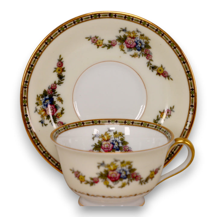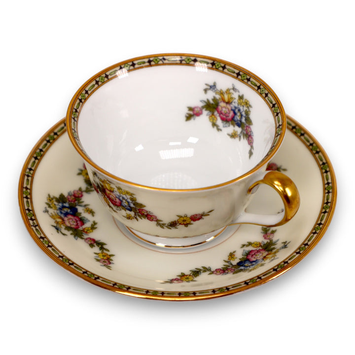 Noritake M Morimura Tea Cup Saucer Set Swags Plain Yellow Band Gold Trim Vintage 1933