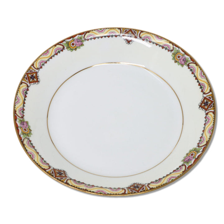 A lovely bone and white porcelain set with amber shaded floral band and gold rimmed. Each piece is marked with Mavaleix et Granger's "Limoges, MG, France" mark It was established by J. Granger and P M de Mavaleix in 1920. The porcelain was decorated at Latrille Freres, which was located in the old abbey in Limoges. They also have the retailer mark for Stern Bros, NY.