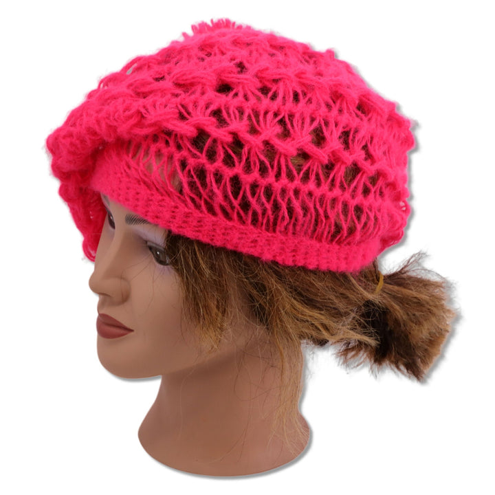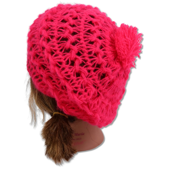 Open Lacey Crochet Knitted Pink Slouchy Tam Hat Pom Pom Top Hand Made