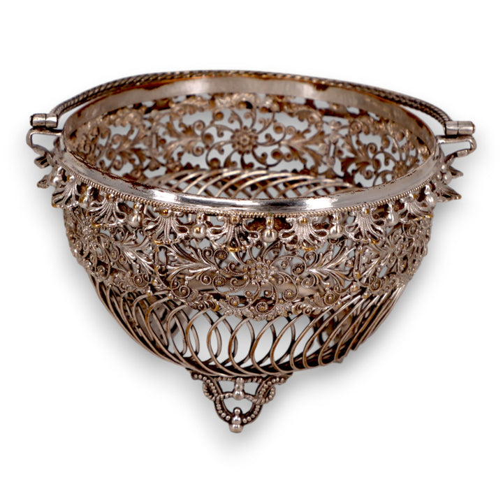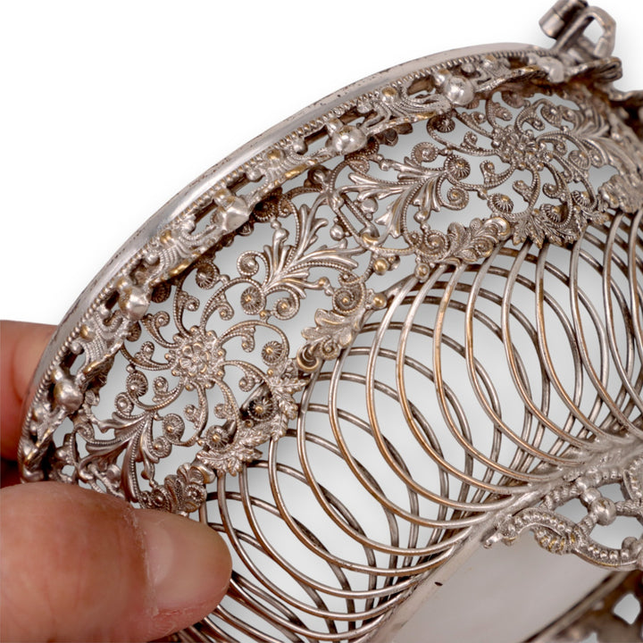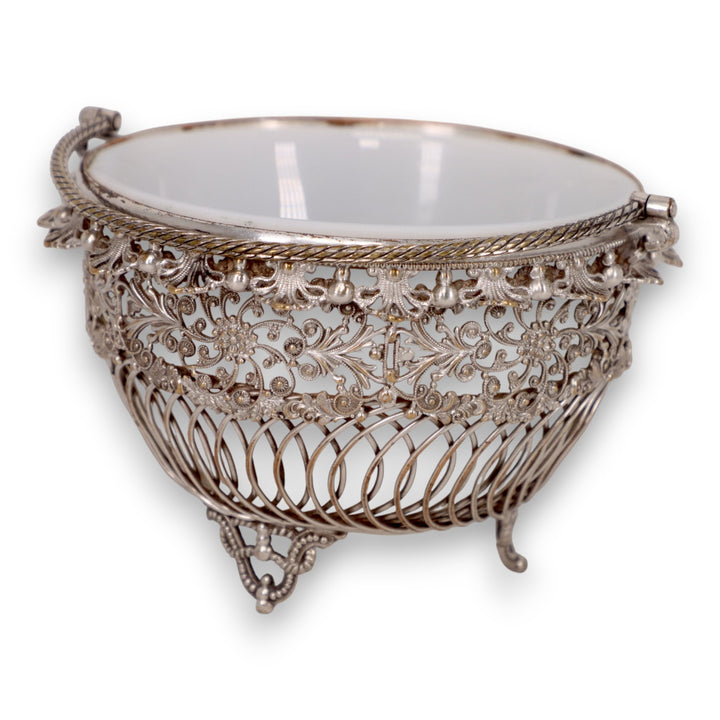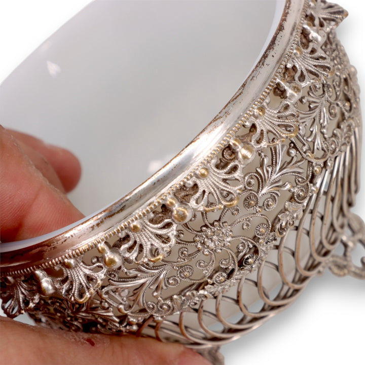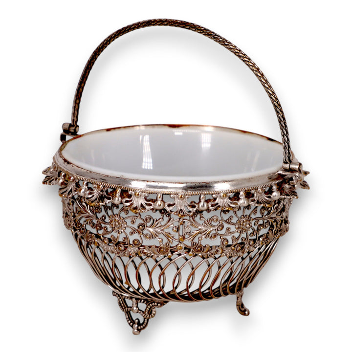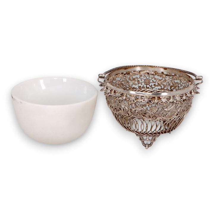 Ornate Silver Filigree Brides Basket with Porcelain Liner Vintage c.1930