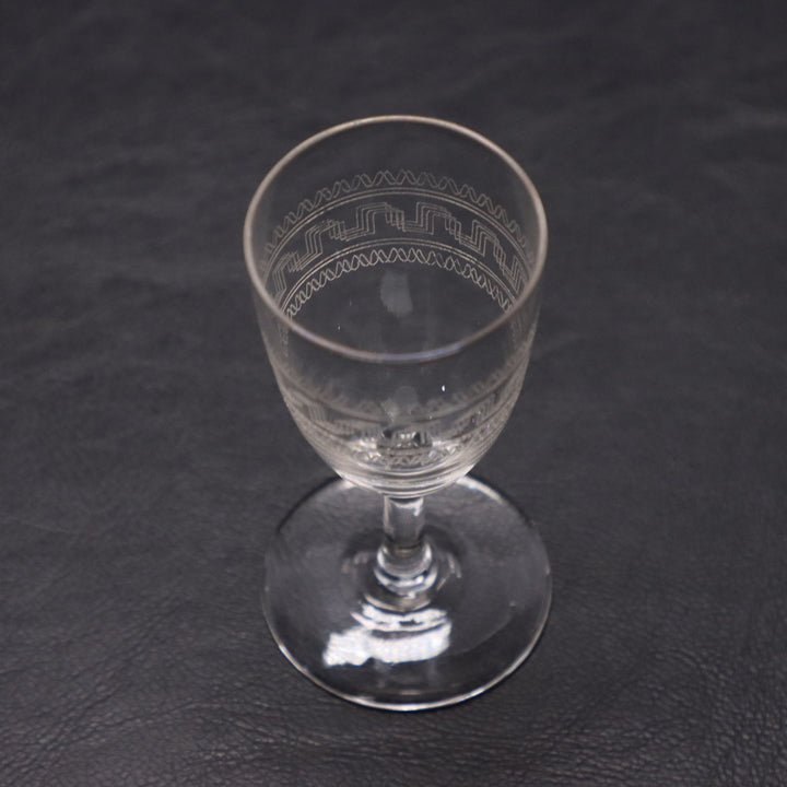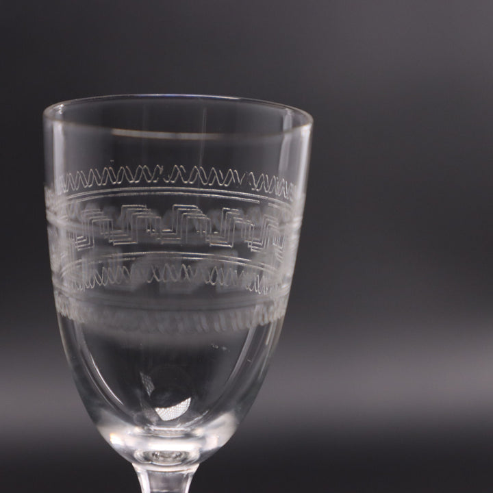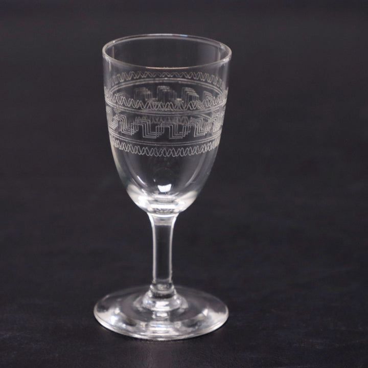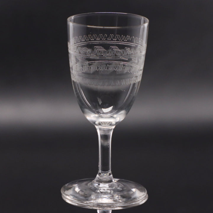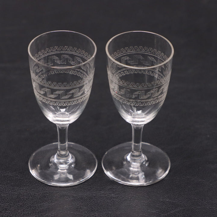Pair of Edwardian Greek Key Etched Sherry Glasses 3 1/2" Antique