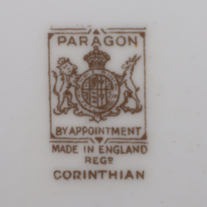Mark: Paragon capital written above frame containing Royal Arm mark, By Appointment capital written below. Fine China Made in England Reg. written beneath, on three rows.