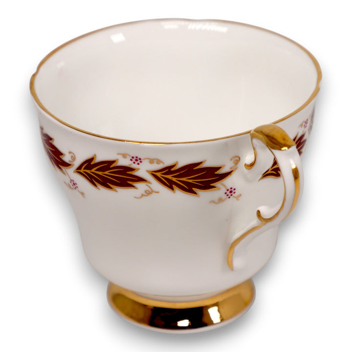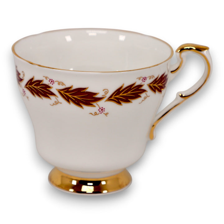 This refined Paragon Elegance teacup displays the sophistication and craftsmanship synonymous with Paragon. Made in England by appointment to Her Majesty the Queen,. Crafted in England from fine bone china, it features a graceful burgundy and gold leaf pattern with delicate vine scrolls and rich 22k gold accents on the foot and handle. The fluted body shape enhances its classic English charm — a timeless addition for collectors or afternoon tea settings.