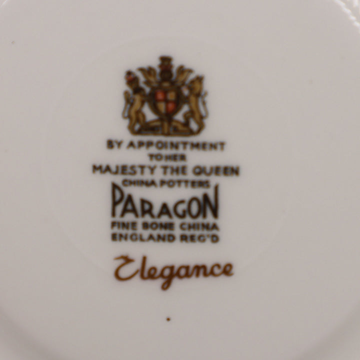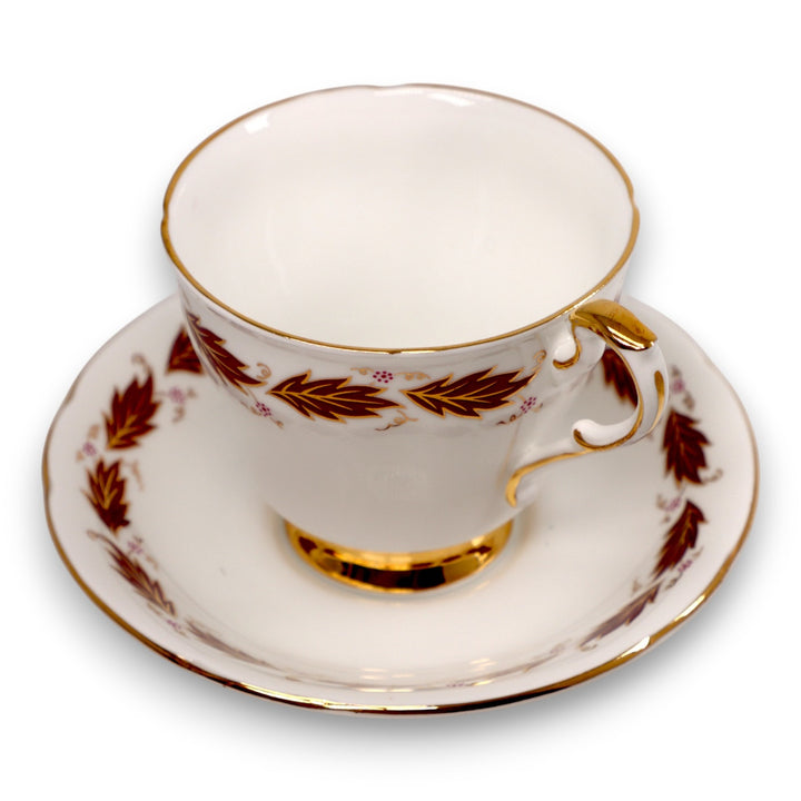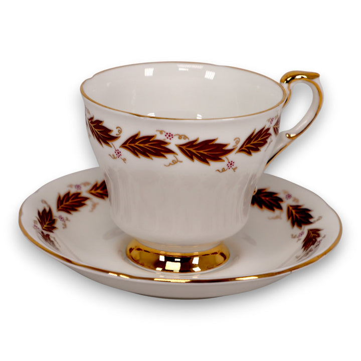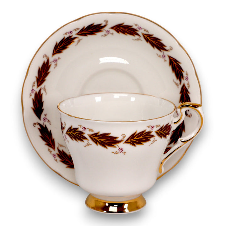 This refined Paragon Elegance teacup and saucer displays the sophistication and craftsmanship synonymous with Paragon. Made in England by appointment to Her Majesty the Queen,. Crafted in England from fine bone china, it features a graceful burgundy and gold leaf pattern with delicate vine scrolls and rich 22k gold accents on the foot and handle. The fluted body shape enhances its classic English charm — a timeless addition for collectors or afternoon tea settings.