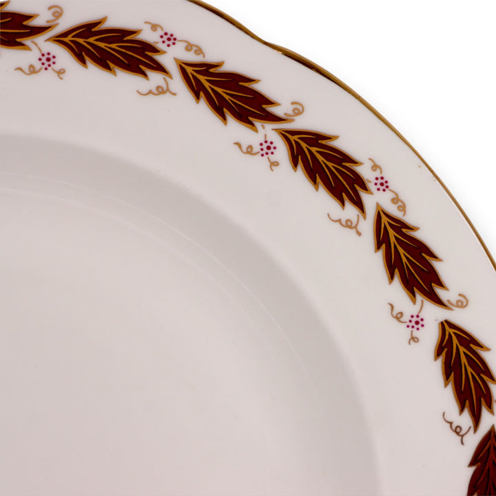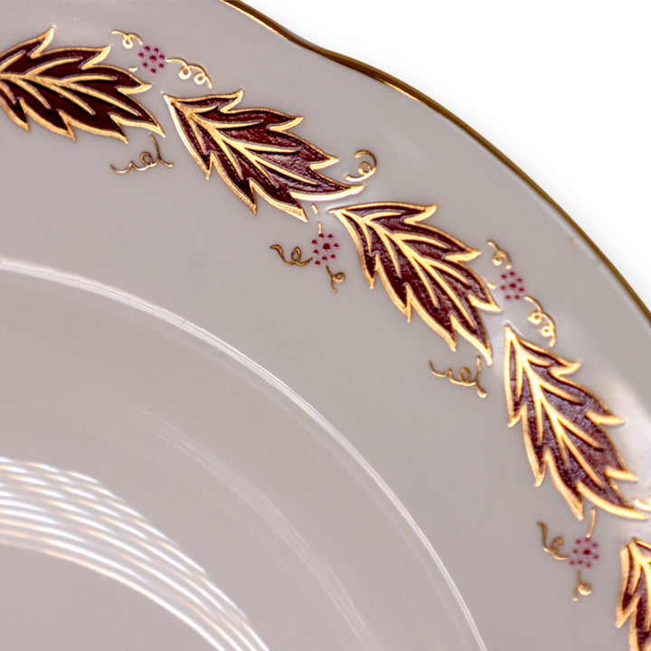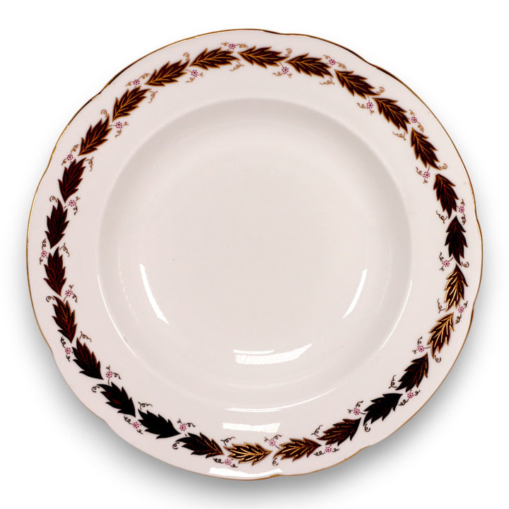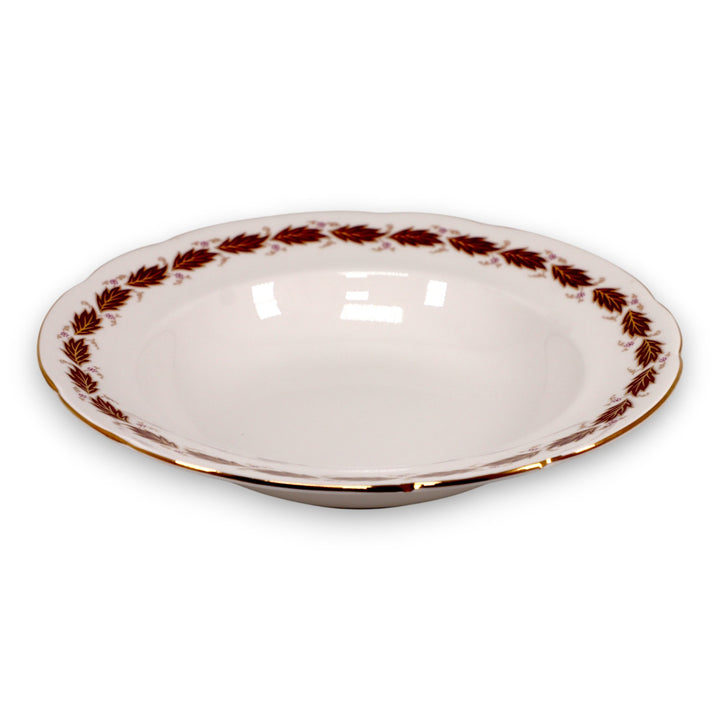 This Paragon Fine Bone China “Elegance” rimmed soup bowl exemplifies the luxurious English craftsmanship that earned Paragon its Royal Warrant as china potters to Her Majesty The Queen. The piece features a sophisticated autumn leaf border in deep burgundy and brown with rich gold gilding. Perfect for collectors or elegant dining, it captures mid-century refinement in both design and quality.