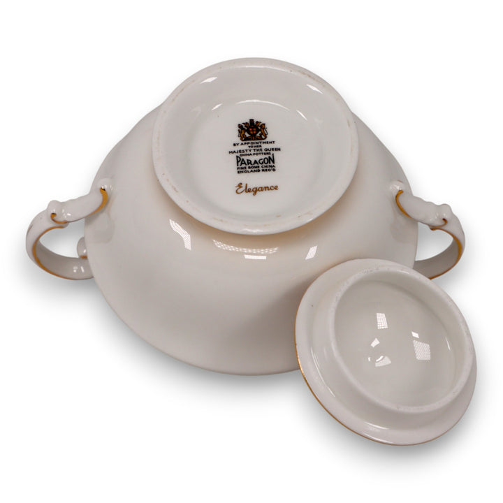 This stunning sugar bowl from Paragon’s “Elegance” pattern is a graceful example of fine English bone china. Decorated with rich burgundy maple leaves accented by hand-applied gold trim, this footed sugar bowl is a refined centerpiece for any formal tea setting or vintage china collection. Made in England by appointment to Her Majesty the Queen, it exemplifies the elegance and prestige associated with mid-20th century Paragon porcelain.