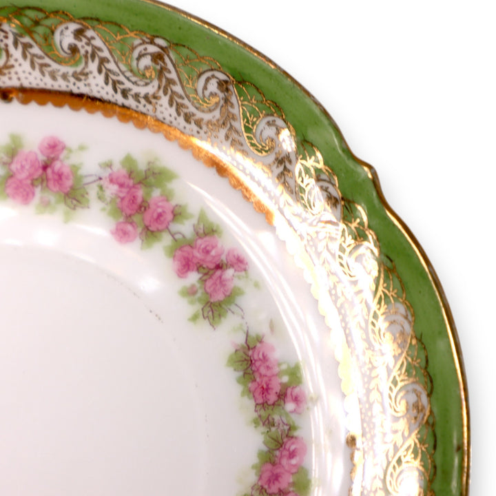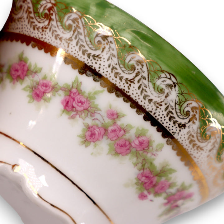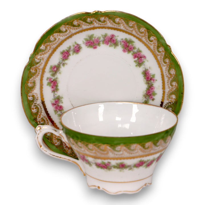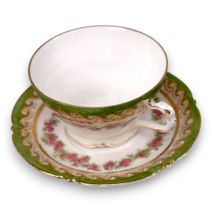 Pink Roses on Green Gold Footed Antique Tea Cup Saucer Set Antique