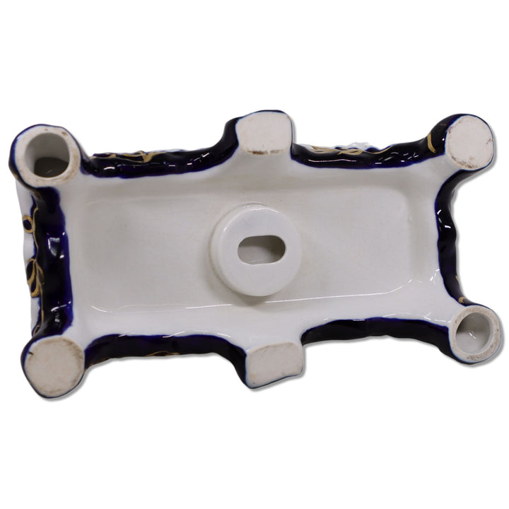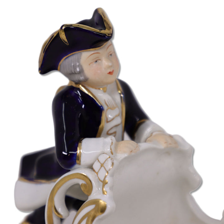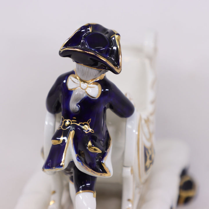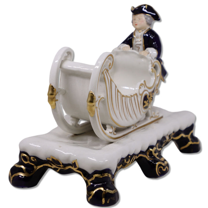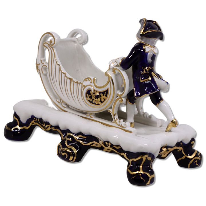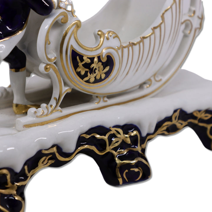 Porcelain Boy with Sleigh Biscuit Cachepot 10" Gold Trimmed Cobalt Blue Vintage