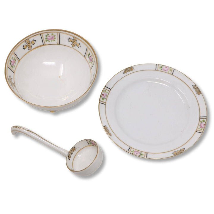 Rising Sun Nippon Soup Bowl with Spoon on Liner Plate HP Gold Pink Roses 1911-21