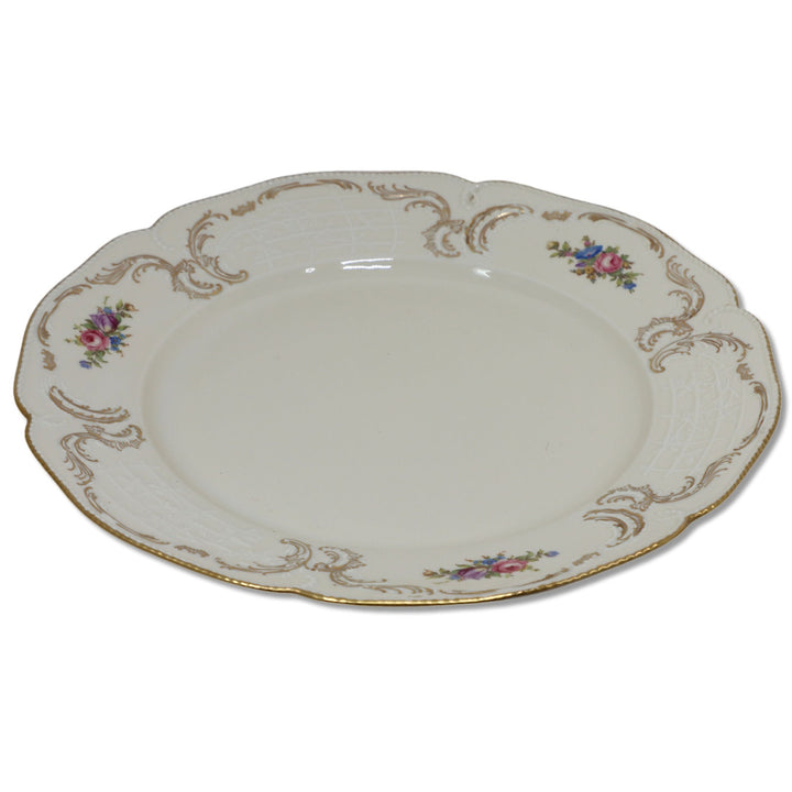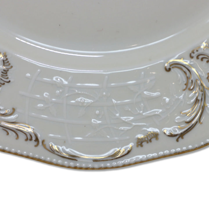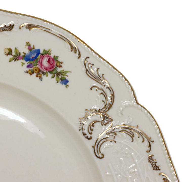 Sanssouci shape, floral bouquets, gold scroll rim. gold scalloped ribbed edge. Embossed panels.
