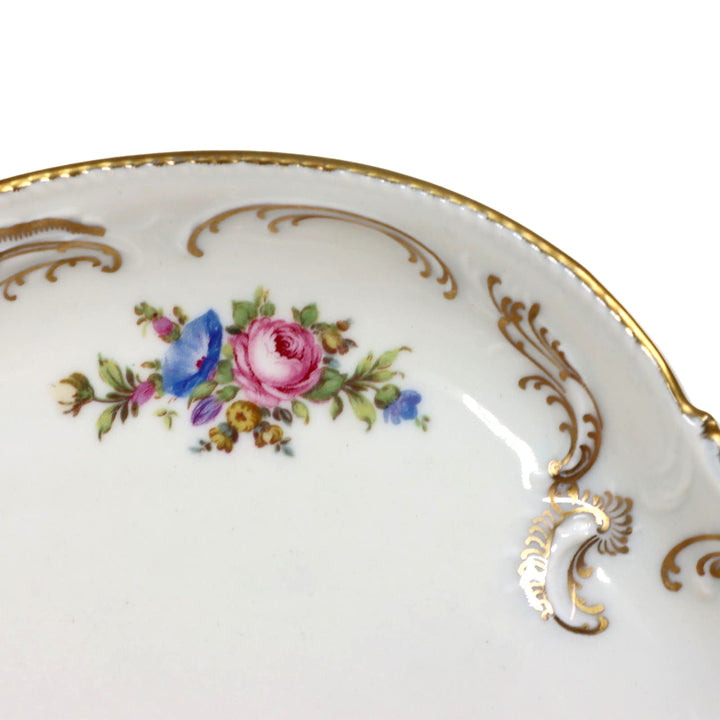 Sanssouci shape, floral bouquets, gold scroll rim. gold scalloped ribbed edge. Embossed panels.