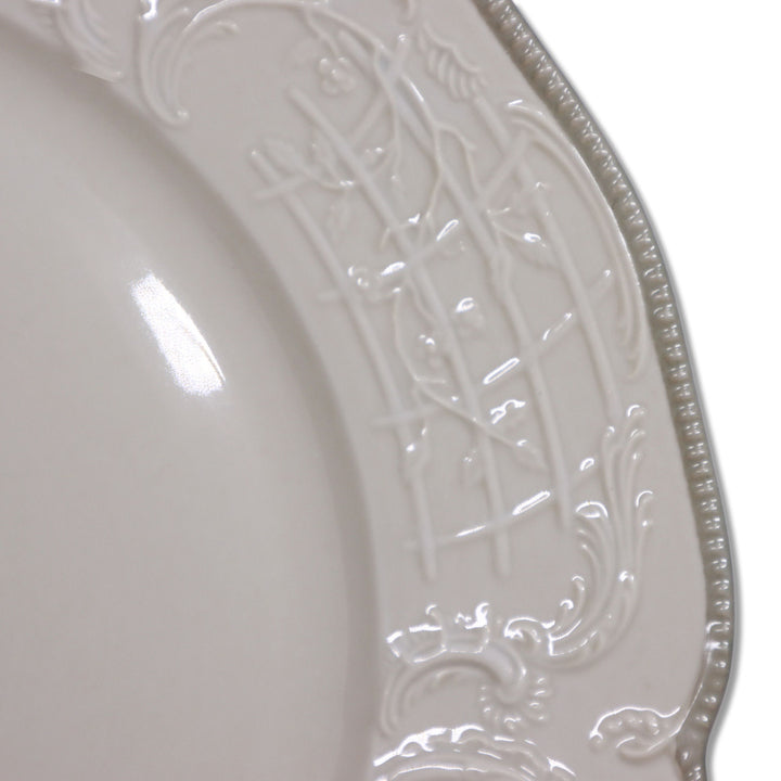 It has a beautiful pattern that is in the mold with scrolls and flowers with green trim on a cream or ivory background.