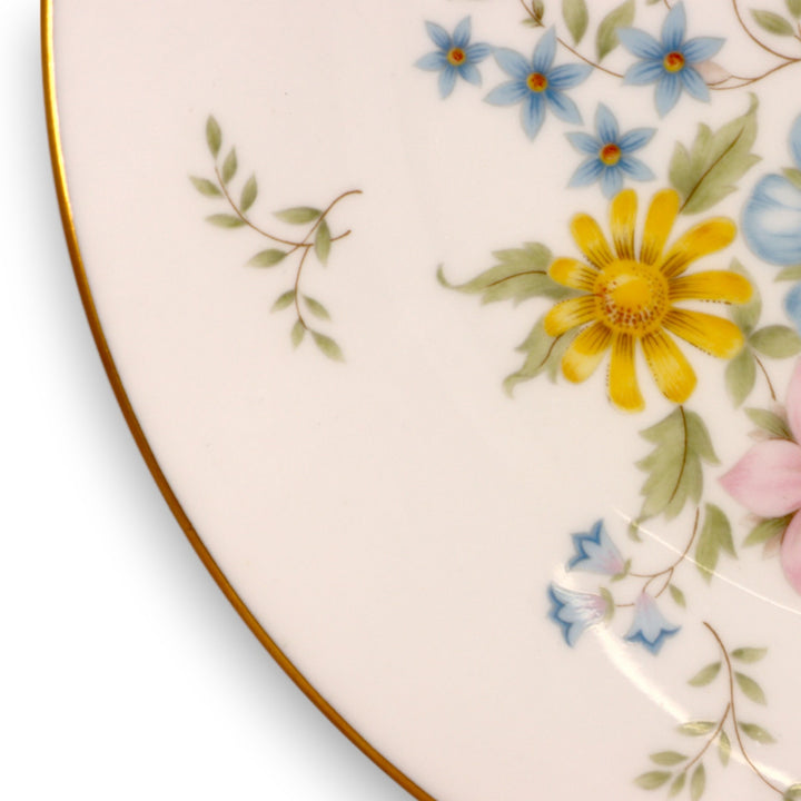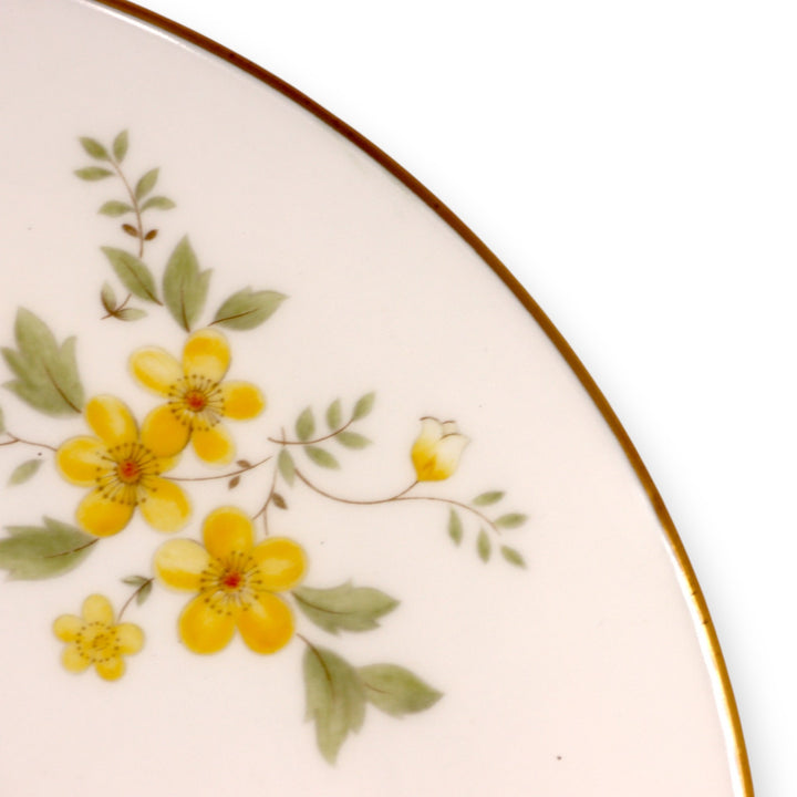 Smooth gold rimmed cream fine china plates with floral motifs.