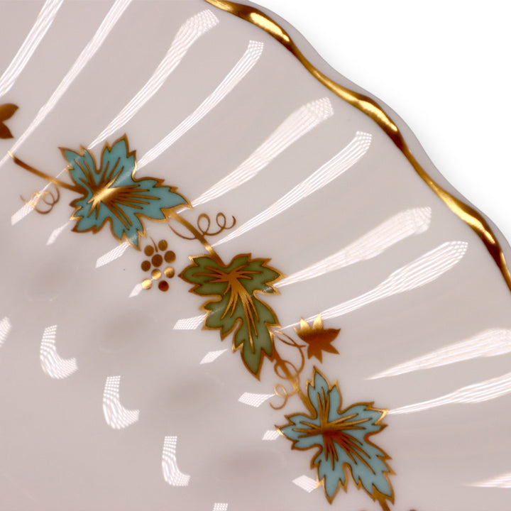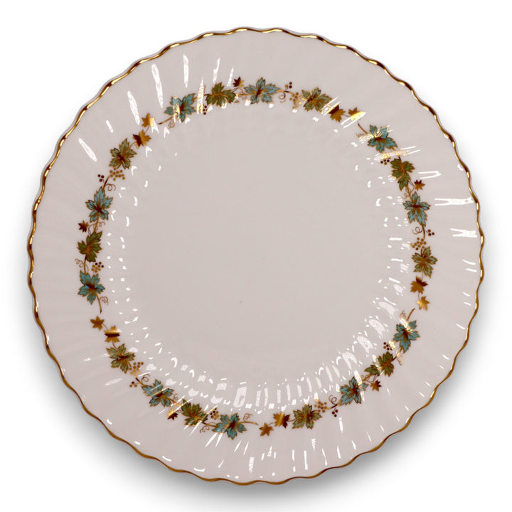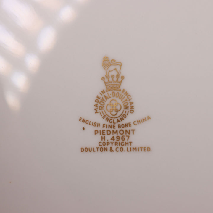 This exquisite Royal Doulton dinner plate in the “Piedmont” pattern (H.4967) exemplifies the timeless elegance of English fine bone china. Manufactured by Doulton & Co. Ltd. in England, this piece features a delicate vine and leaf motif in rich gold, soft turquoise, and earthy green accents. A softly scalloped rim trimmed in lustrous gold gives this plate its refined, collectible charm. Produced in the 1990s, it's ideal for collectors or anyone enhancing a fine table setting with vintage English china.