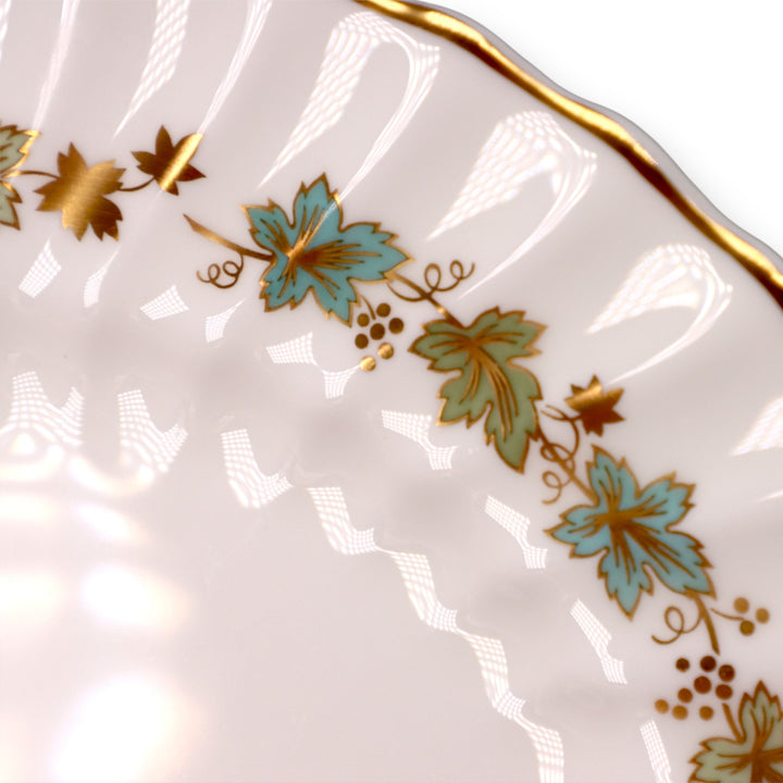 This exquisite Royal Doulton salad plate in the “Piedmont” pattern (H.4967) exemplifies the timeless elegance of English fine bone china. Manufactured by Doulton & Co. Ltd. in England, this piece features a delicate vine and leaf motif in rich gold, soft turquoise, and earthy green accents. A softly scalloped rim trimmed in lustrous gold gives this plate its refined, collectible charm. Produced in the 1990s, it's ideal for collectors or anyone enhancing a fine table setting with vintage English china.