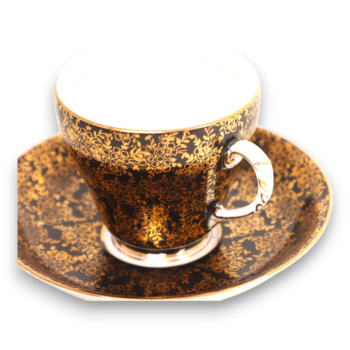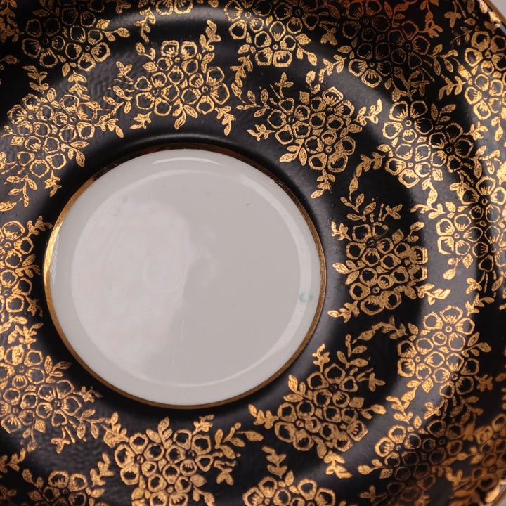 Royal Grafton Black and Gold Flowers Footed Tea Cup Saucer Set England Vintage