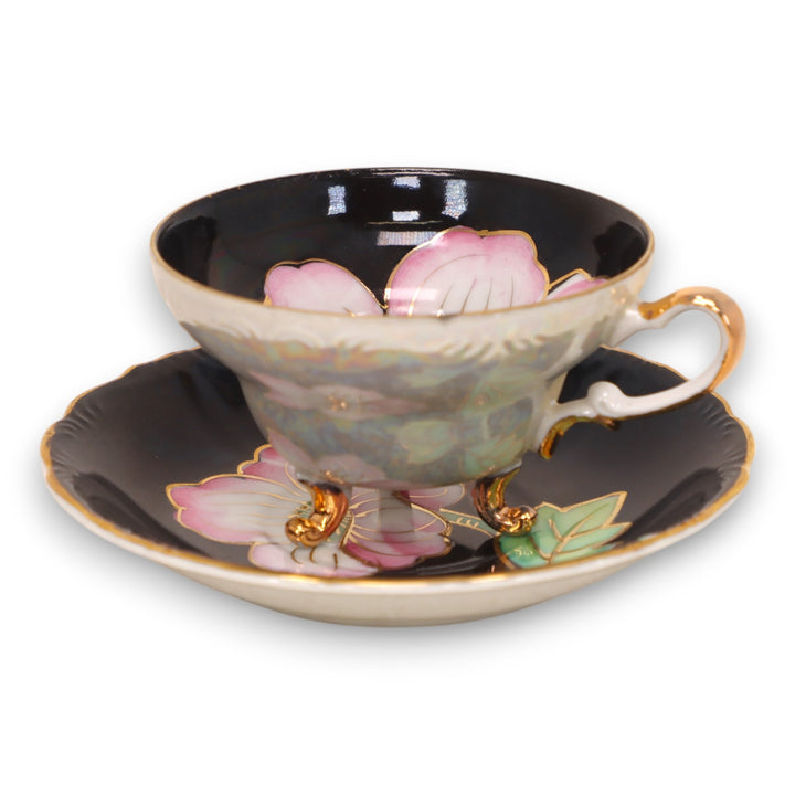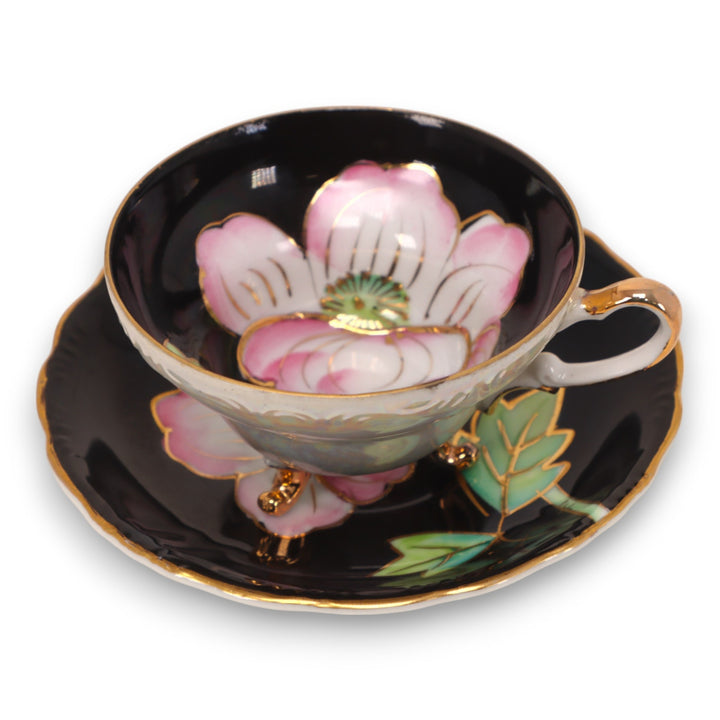 Royal Sealy Black with Pink Flower Footed Tea Cup Saucer Set Japan Vintage