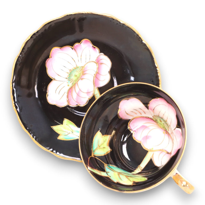 Royal Sealy Black with Pink Flower Footed Tea Cup Saucer Set Japan Vintage 1940's