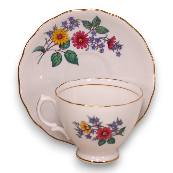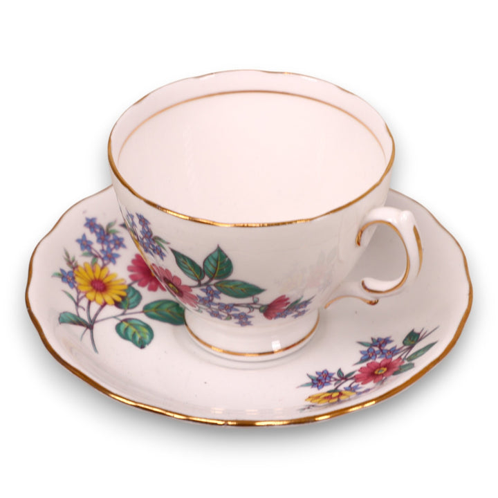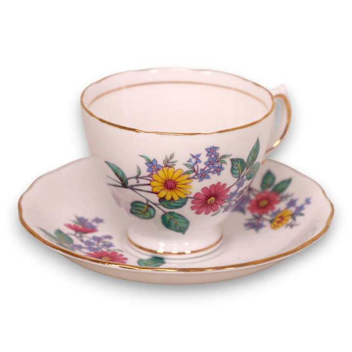 Royal Vale 6921 Yellow Pink Flower Footed Tea Cup Saucer Set England Vintage