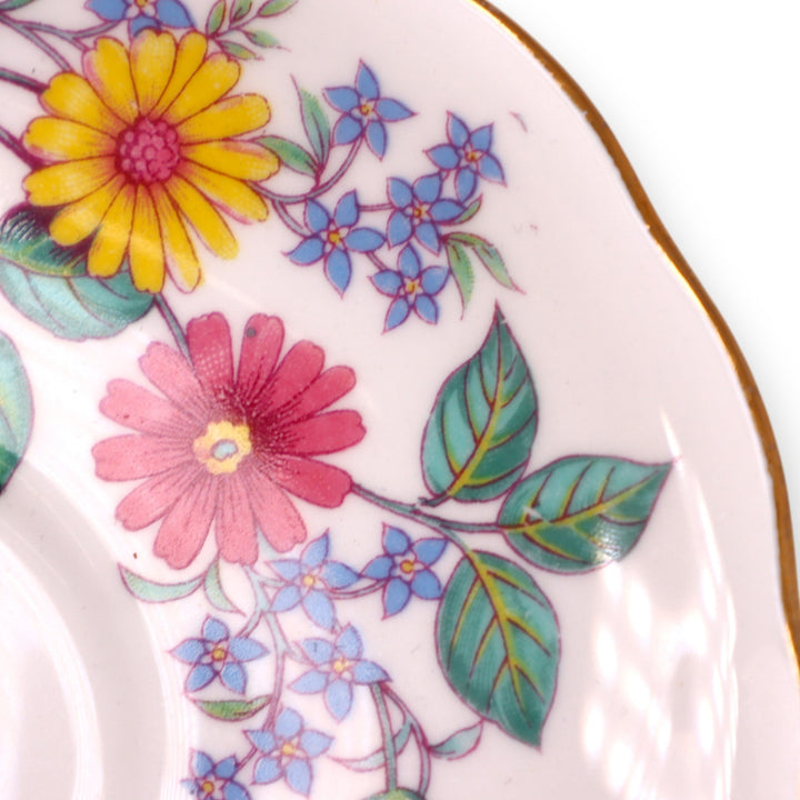 Description: Yellow & Pink Flowers, Scalloped, Gold Trim