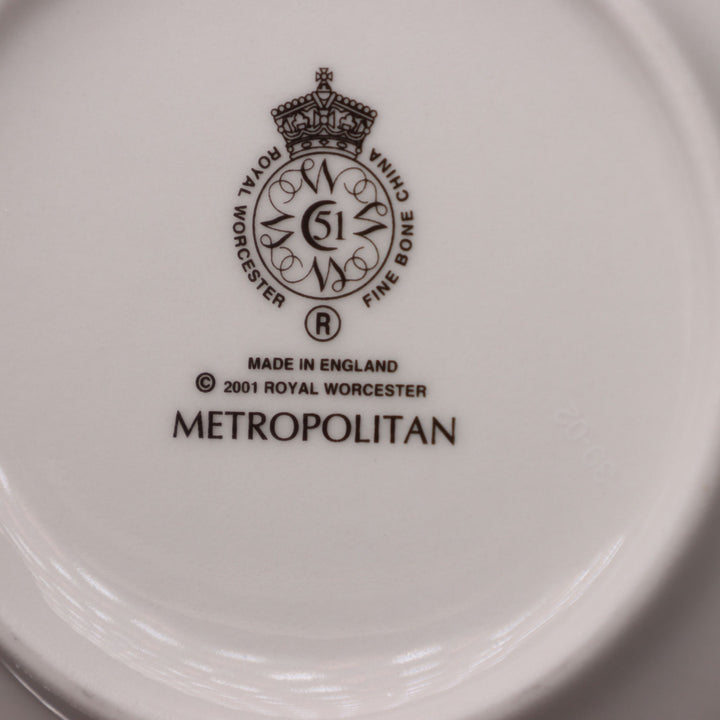 This elegant Royal Worcester “Metropolitan” cereal bowl features a bold and vibrant Art Deco-inspired geometric rim in red, blue, gold, and black with a solid white center. Crafted in England of fine bone china, it combines contemporary aesthetics with timeless craftsmanship. This piece dates to 2001, making it a collectible modern classic with a vintage appeal, perfect for display or upscale dining.