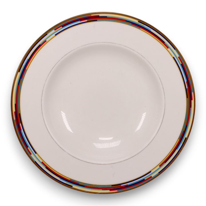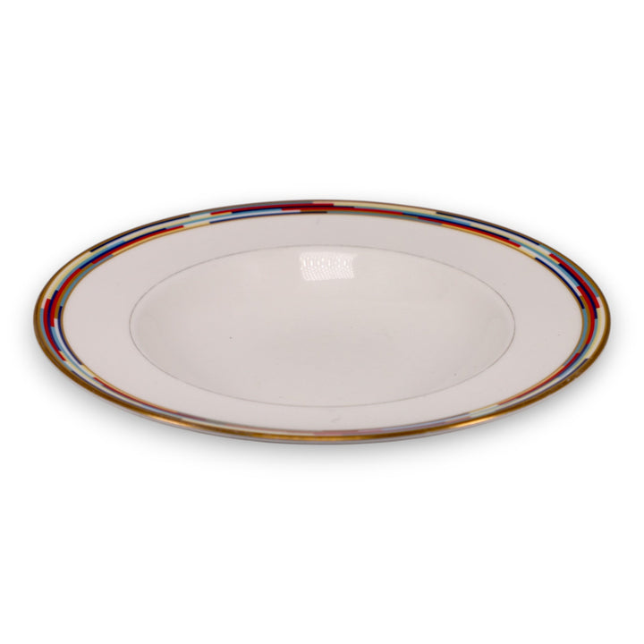 This elegant Royal Worcester “Metropolitan” rimmed soup bowl features a bold and vibrant Art Deco-inspired geometric rim in red, blue, gold, and black with a solid white center. Crafted in England of fine bone china, it combines contemporary aesthetics with timeless craftsmanship. This piece dates to 2001, making it a collectible modern classic with a vintage appeal, perfect for display or upscale dining.