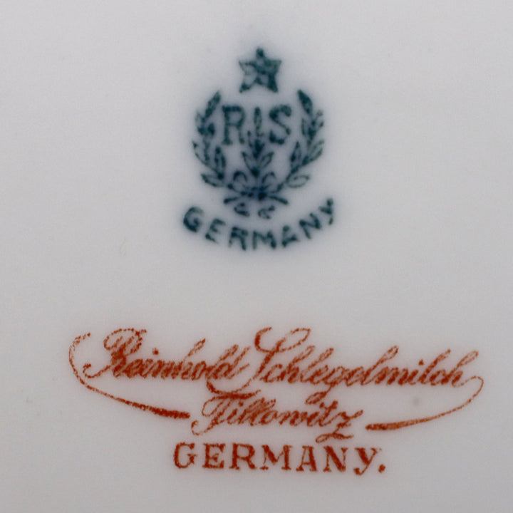 Has 1920 - 1944 blue RS Germany Tillowitz mark. Below that is the red Reinhold Schlegelmilch , Tillowitz, Germany mark which dates for 1916 to 1930.