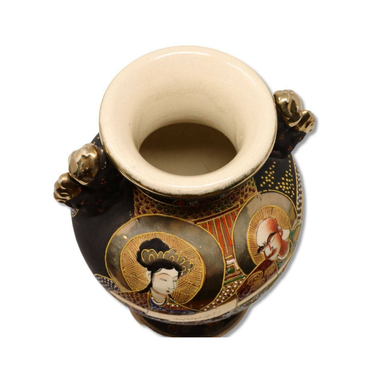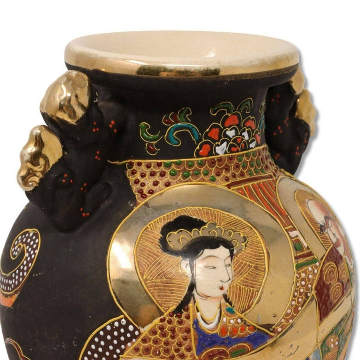 Satsuma 10” Signed Vase Fu Foo Dog Handled Footed Enamel Gold Moriage Man Woman Landscape Very good condition. Enamel and gold are excellent. Solid, no cracks or repairs. Only one chip on base ring in the back. See pics for detail.