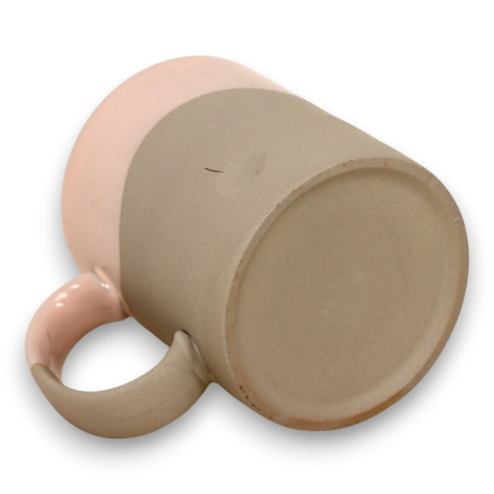 This is a beautifully hand-crafted studio pottery mug featuring a minimalist two-tone design. The upper half has a glossy pale pink glaze, while the lower half remains natural taupe stoneware with an impressed leaf motif. The mug has a clean modernist style and is likely studio-made in the 1990s. It is sturdy, functional, and collectible, appealing to lovers of handmade ceramics and Scandinavian-inspired design.