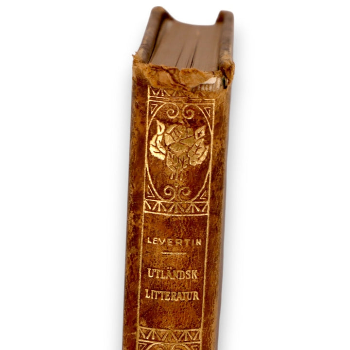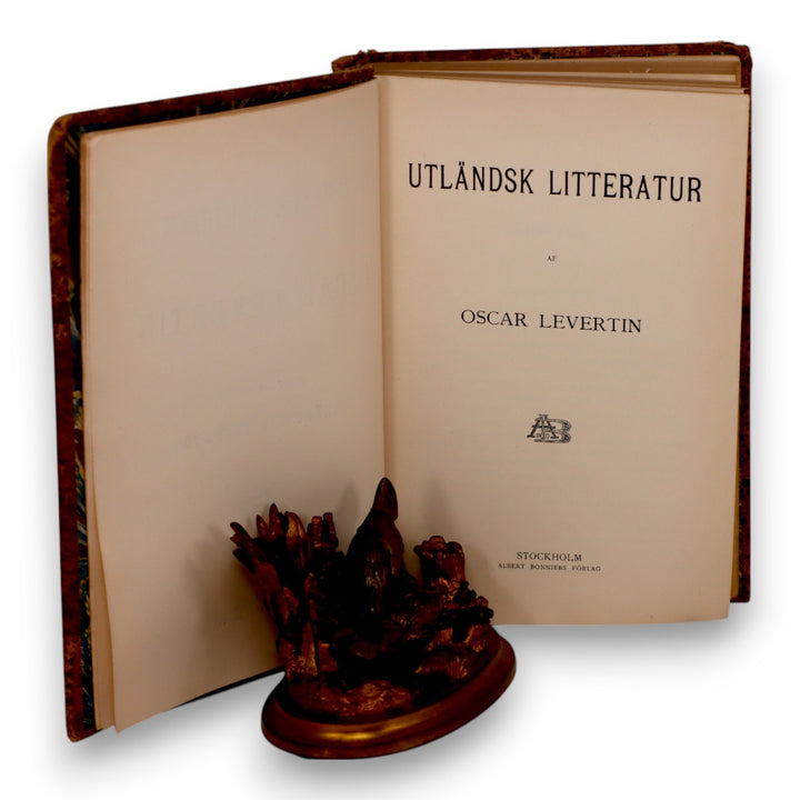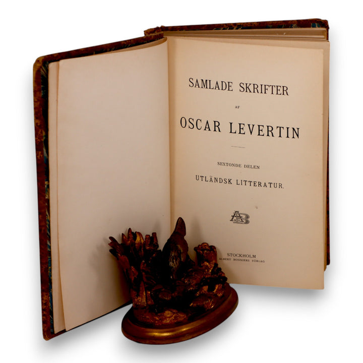 A stunning antique edition of Utländsk Litteratur (Foreign Literature) by renowned Swedish literary historian Oscar Levertin, part of his Samlade Skrifter (Collected Works). This is the sixteenth volume, beautifully bound with rich gilt spine detailing and vibrant marbled endpapers, published by Albert Bonniers Förlag, Stockholm.
