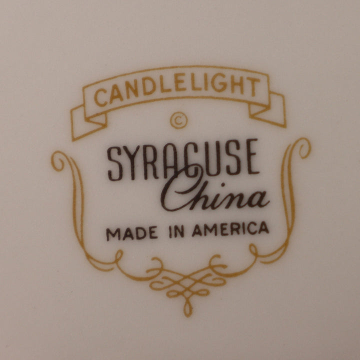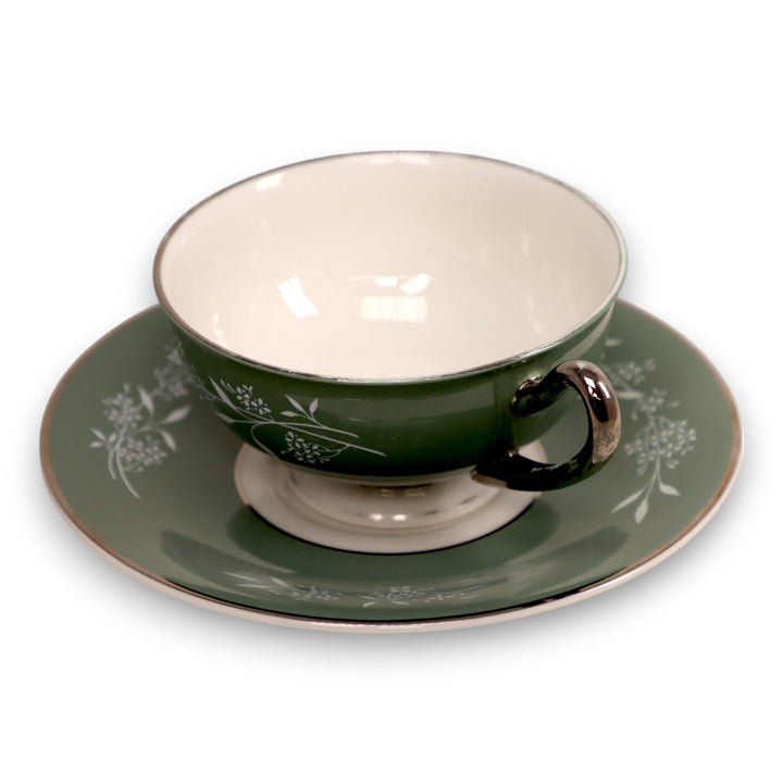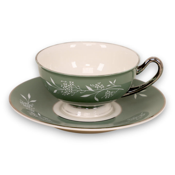 Syracuse Candlelight White Flowers on Green Rim Footed Tea Cup and Saucer Set USA