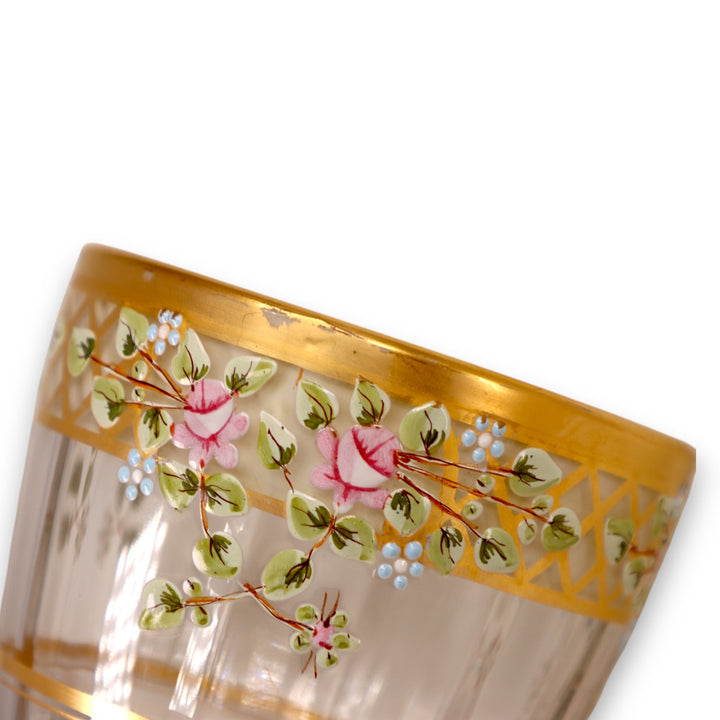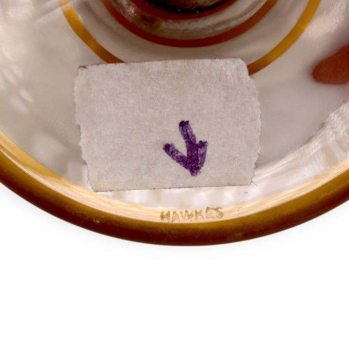 Very good condition with some gold wear around base rim as seen in pics. Hand painted floral motifs are in exceptional condition. No chips or cracks. Hand signed on bottom. "HAWKES"