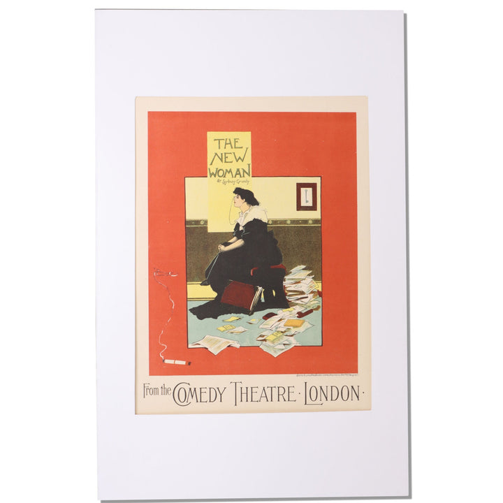 Colour lithograph poster advertising a performance of 'The New Woman' by Sydney Grundy at the Comedy Theatre, London. Designed by Albert George Morrow, London, 1894. 'The New Woman' by Sydney Grundy, was first produced at the Comedy Theatre, London, 1 September 1894.