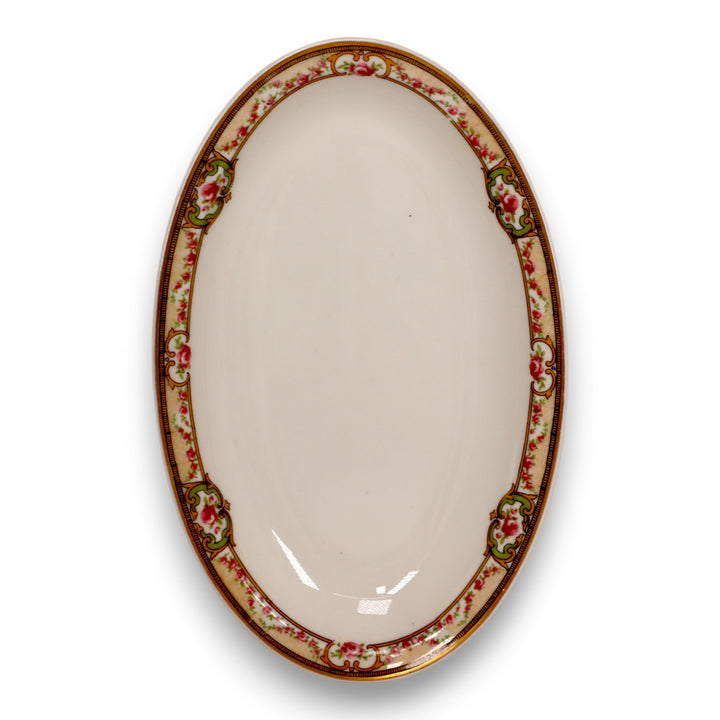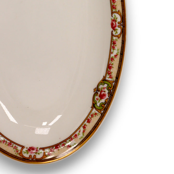 This elegant oval asparagus relish dish was crafted by Théodore Haviland of Limoges, France, in the early 1900s. The “The Belfort” pattern features a delicate rose garland border with scrolling green and gold accents and fine gilt trim. Known for its craftsmanship and beauty, Haviland porcelain embodies timeless French artistry. This antique piece is perfect for collectors or as a graceful addition to a vintage table setting.