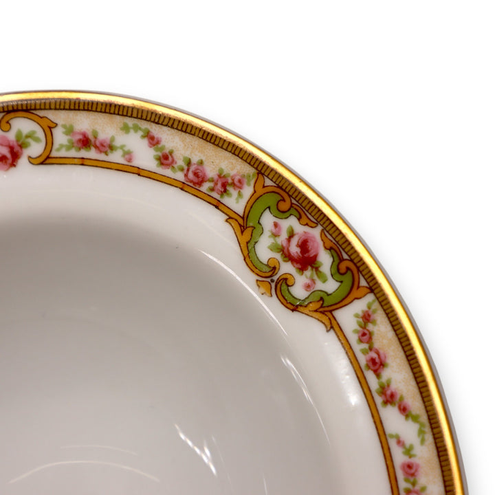 This elegant oval vegetable bowl was crafted by Théodore Haviland of Limoges, France, in the early 1900s. The “The Belfort” pattern features a delicate rose garland border with scrolling green and gold accents and fine gilt trim. Known for its craftsmanship and beauty, Haviland porcelain embodies timeless French artistry. This antique piece is perfect for collectors or as a graceful addition to a vintage table setting.