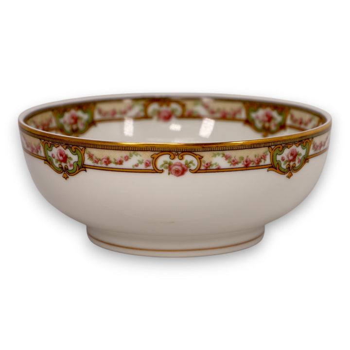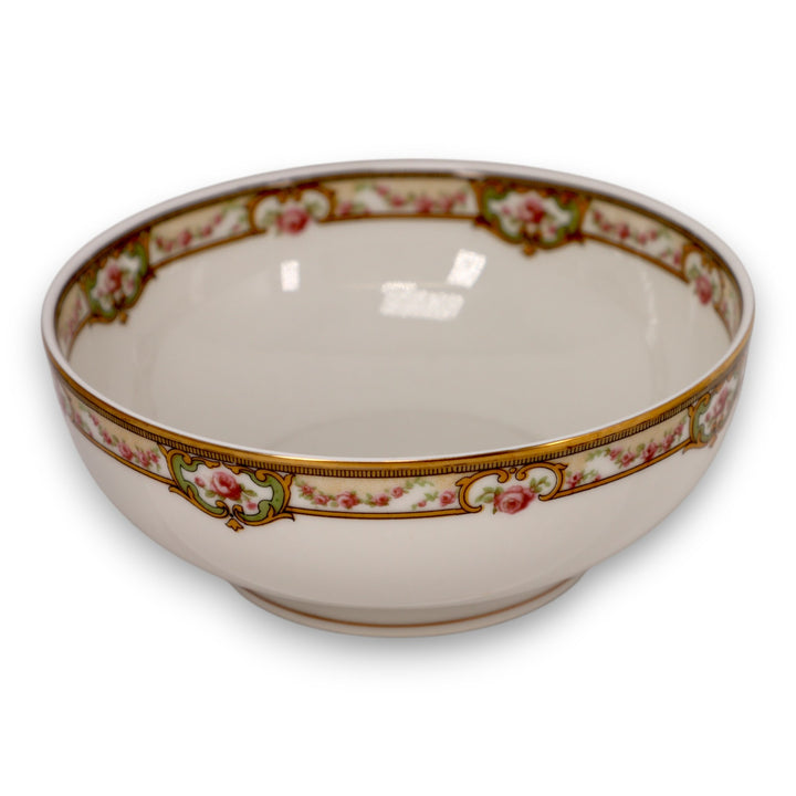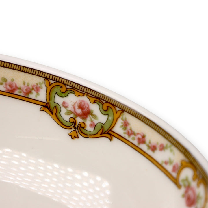 This elegant soup bowl was crafted by Théodore Haviland of Limoges, France, in the early 1900s. The “The Belfort” pattern features a delicate rose garland border with scrolling green and gold accents and fine gilt trim. Known for its craftsmanship and beauty, Haviland porcelain embodies timeless French artistry. This antique piece is perfect for collectors or as a graceful addition to a vintage table setting.