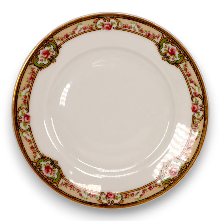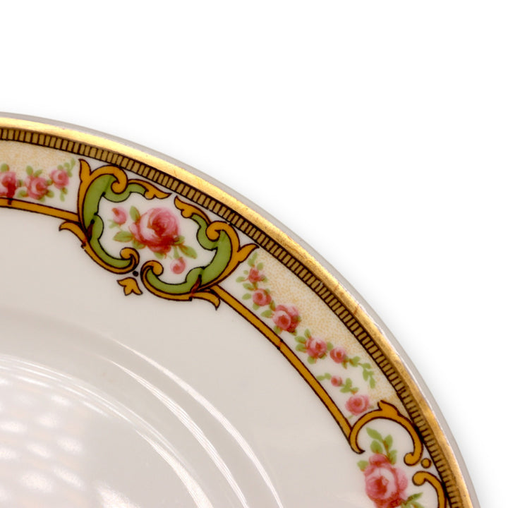 This charming bread plate by Théodore Haviland Limoges is from the exquisite “The Belfort” pattern, showcasing a garland of delicate pink roses encircling the rim, highlighted with intricate scrollwork and gilded accents. Crafted in France during the 1910, this vintage porcelain piece embodies the refined elegance and craftsmanship of French Limoges china. Its classic style complements both antique and modern table settings and is perfect for collectors or those looking to complete a set.