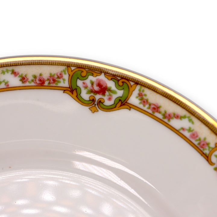 This charming lunch plate by Théodore Haviland Limoges is from the exquisite “The Belfort” pattern, showcasing a garland of delicate pink roses encircling the rim, highlighted with intricate scrollwork and gilded accents. Crafted in France during the 1910, this vintage porcelain piece embodies the refined elegance and craftsmanship of French Limoges china. Its classic style complements both antique and modern table settings and is perfect for collectors or those looking to complete a set.