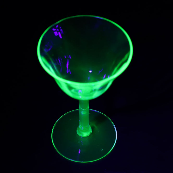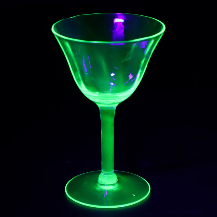 This exquisite Tiffin Franciscan #14196 optic green uranium cocktail glass glows brilliantly under UV light, displaying the signature vibrant fluorescence of Depression-era uranium glass. The elegant optic bowl catches light beautifully, while the hand-blown stem and flared lip embody 1930s American craftsmanship. A stunning collectible piece perfect for Art Deco enthusiasts and vintage glassware collectors alike.