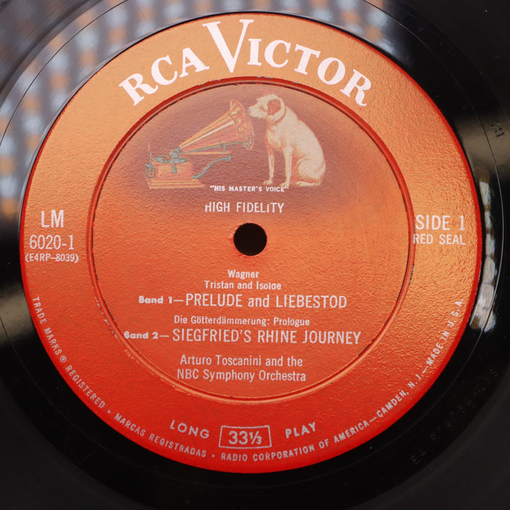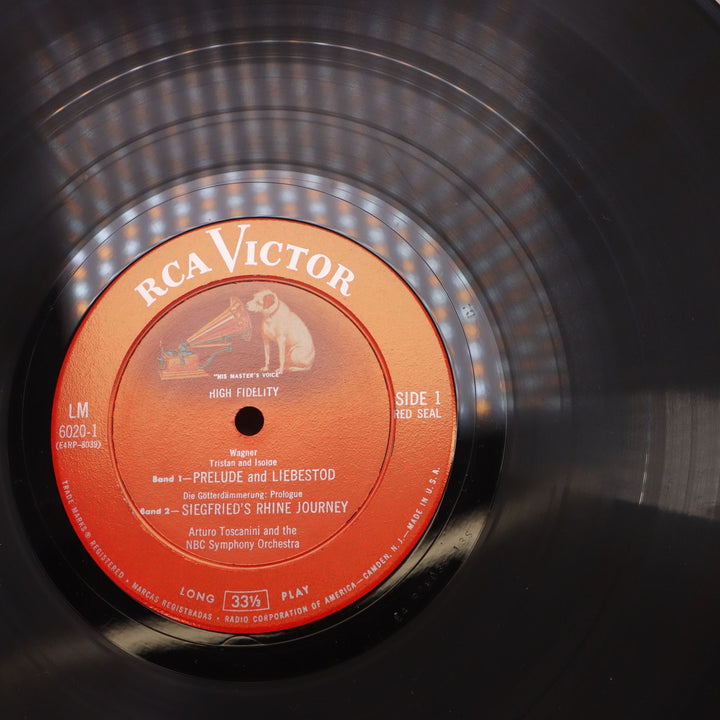 This listing features a vintage RCA Victor Red Seal LP, Toscanini Conducts Wagner, catalog number LM-6020. This high-fidelity 33⅓ RPM record includes works by Richard Wagner, performed by Arturo Toscanini and the NBC Symphony Orchestra.