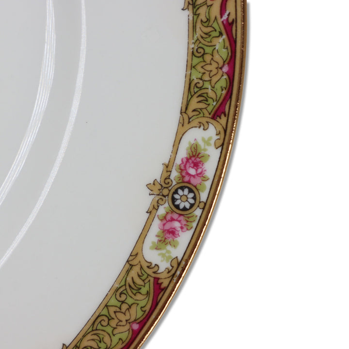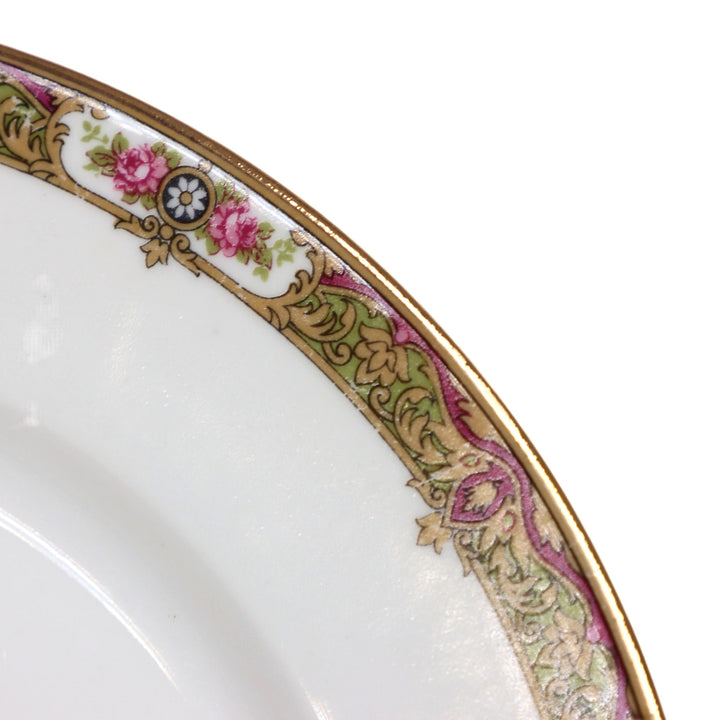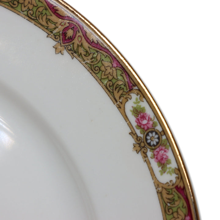 Pink Roses, Maroon, Tan & Green Border, gold rim
