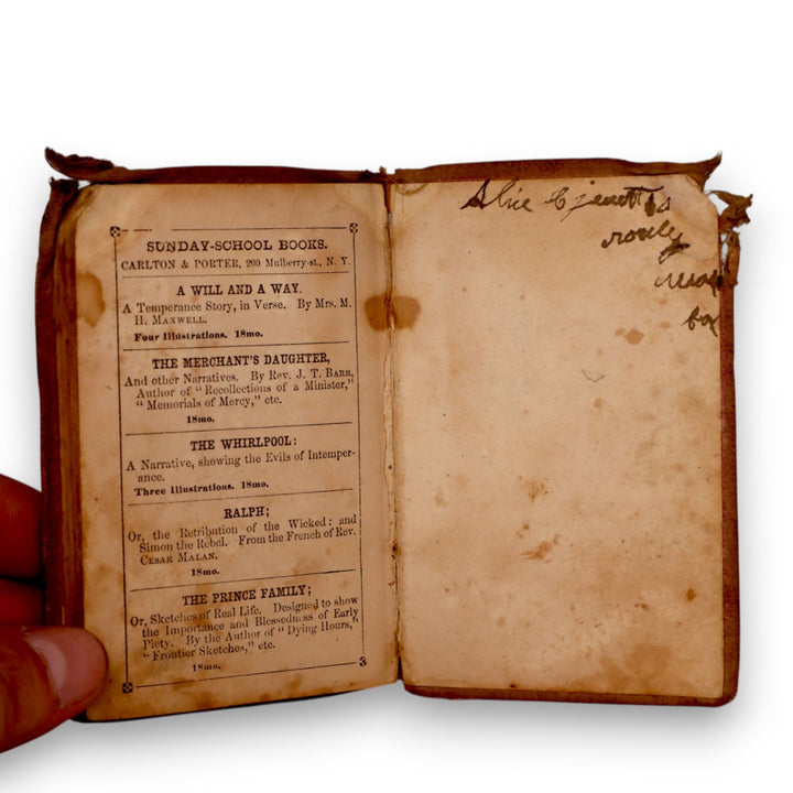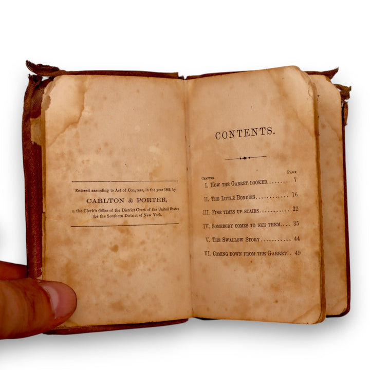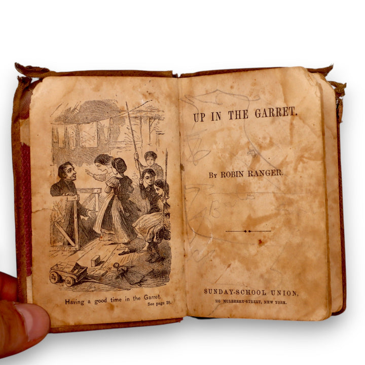 A charming and well-worn antique children's Christian storybook titled “Up in the Garret” by Robin Ranger, published by Sunday-School Union, 200 Mulberry St., New York. Copyrighted in 1861 by Carlton & Porter, this mid-19th-century illustrated volume was intended for religious education and moral instruction.