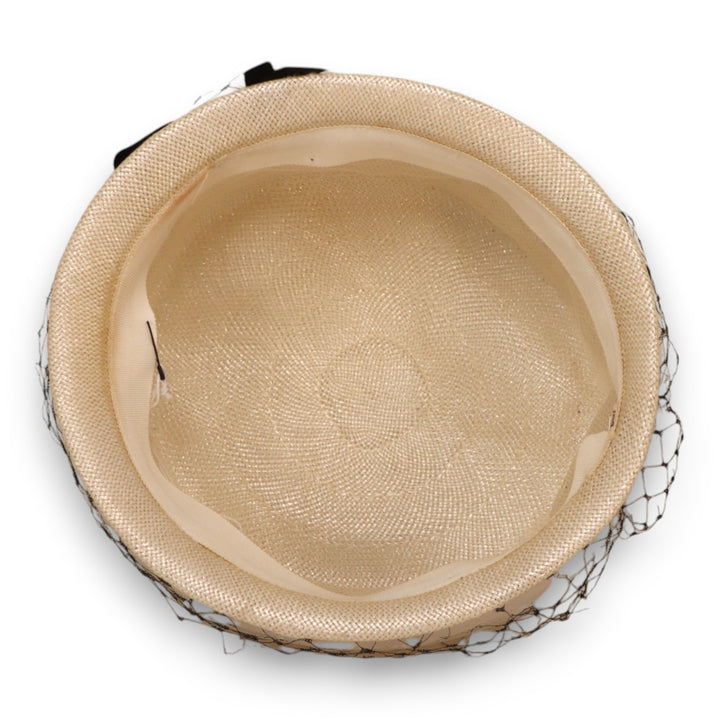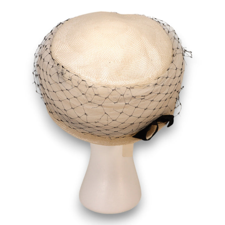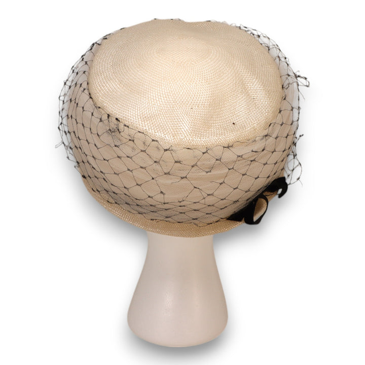 Vintage Pillbox 1950s Straw Hat w/ Veil Black Velvet Bow Size SM Cocktail Style