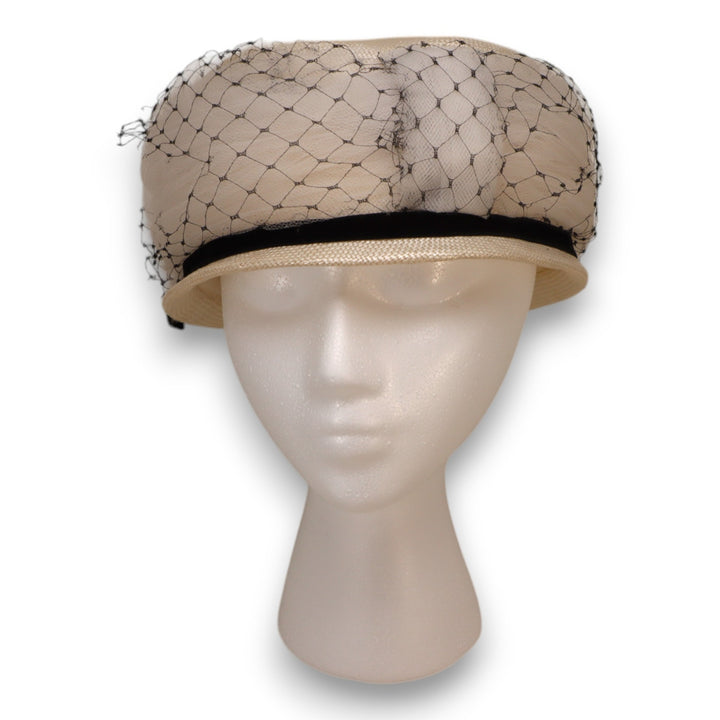 Add timeless elegance to your wardrobe with this charming vintage 1950s ladies hat. Crafted from fine straw, this pillbox-style hat features a dramatic black veil overlay and is accented with a soft black velvet band and bow. Perfect for cocktail parties, weddings, or retro fashion lovers.