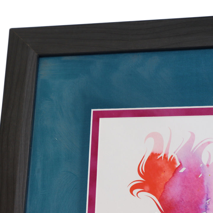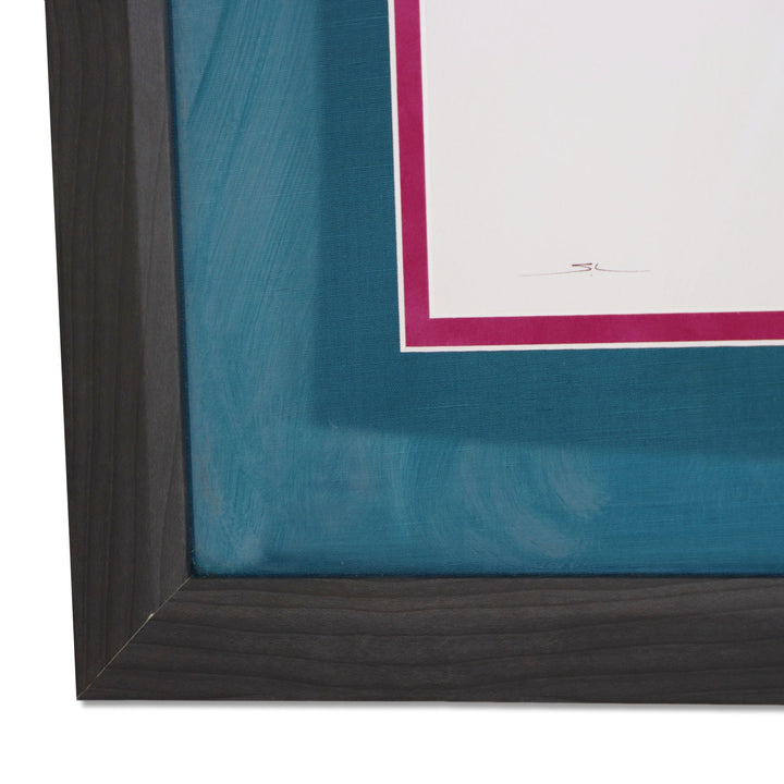 Double matted with a teal shimmery fabric and and inside of magenta.