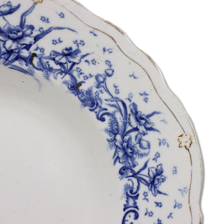 Scalloped edge with gold accents. Transfer on band is blue floral