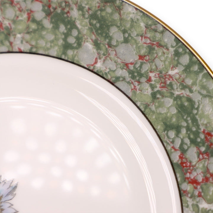 Design Style: Marbled green and red rim with central blue flower, gold trim
