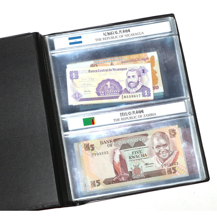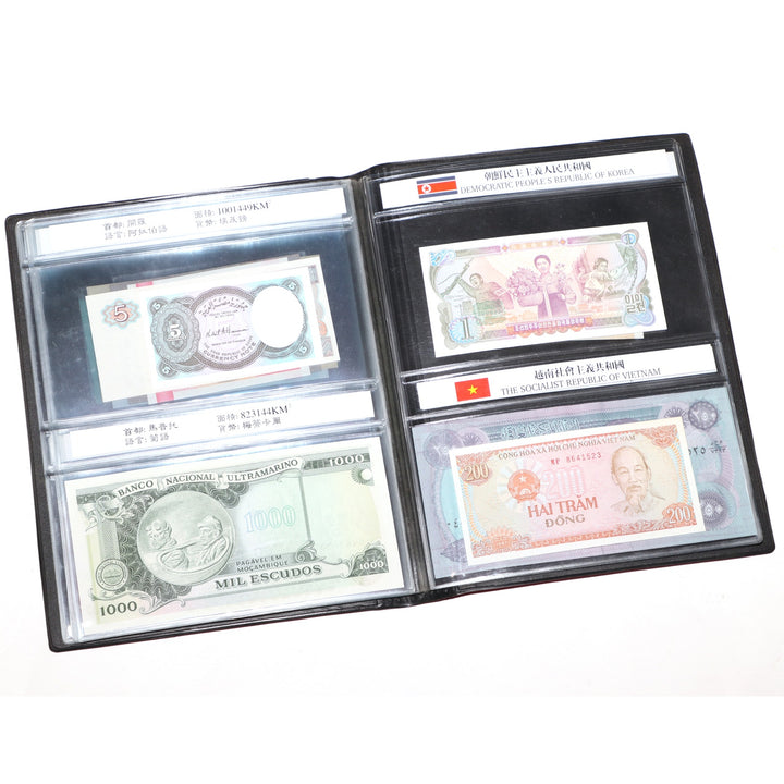 This collectible World Paper Money Album from the Kowloon Philatelic Centre in Hong Kong features banknotes from 30 countries and regions. A beautifully presented collector’s album, it includes colorful currency from places such as Nicaragua, Zambia, North Korea, Vietnam, Mozambique, and more. Encased in a red faux leather cover stamped in gold, it’s an impressive way to showcase and preserve international banknotes for hobbyists and collectors alike.