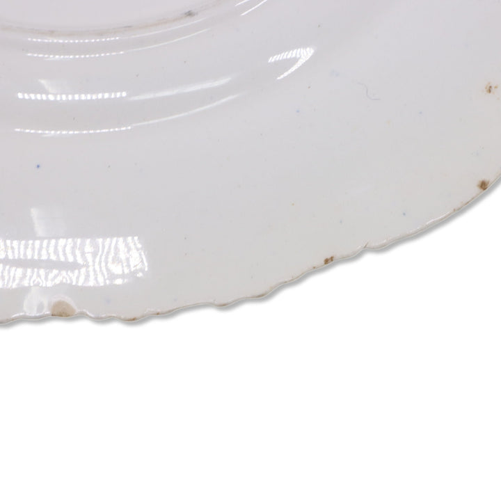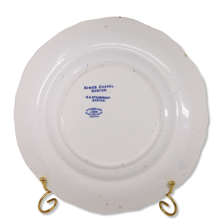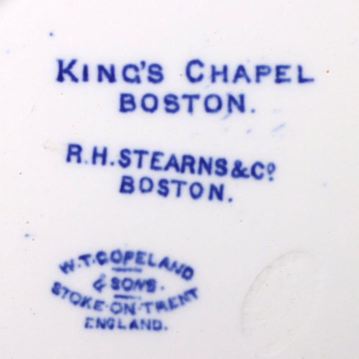Marked for retailer "R.H. Stearns & Co, Boston" on back. Blue transfer of King's Chapel in Boston on a scalloped and embossed rim plate.