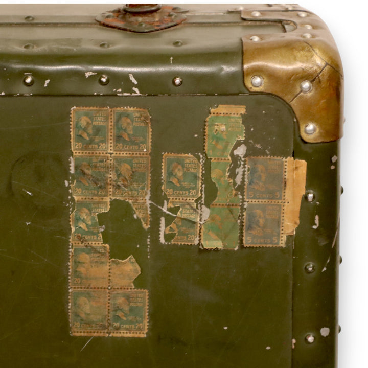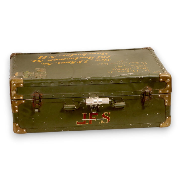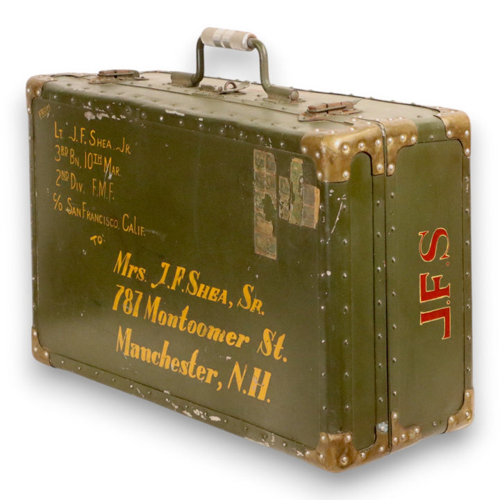 This is an authentic WWII-era U.S. Marine Corps officer’s footlocker trunk belonging to Lt. J.F. Shea Jr., 3rd Battalion, 10th Marines, 2nd Division, Fleet Marine Force. The trunk is painted olive drab with stenciled shipping information, addressed to his family in Manchester, New Hampshire.NH with 14 20 cent and two 5 cent stamps as postage
